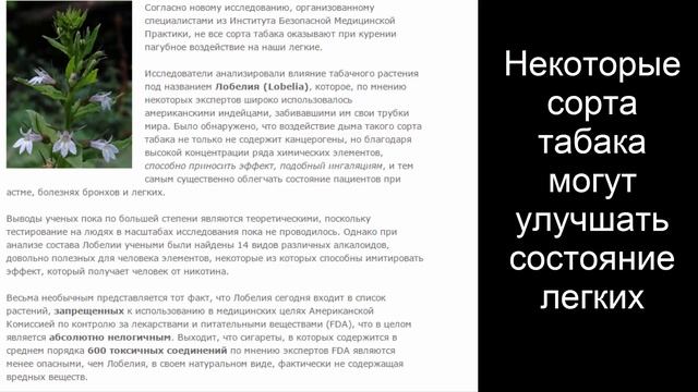 Лечение бронхиальной астмы цветком Лобелией и борьба с никотиновой зависимостью Лобелия - средство при отравлении наркотиками, окисью углерода, астме, кашле, коклюше, солнечных и тепловых ударах, тяжелых инфекционных заболеваниях, для возбуждения дыхательного центра, стимуляции функции надпочечников. В связи с катастрофической эпидемией бронхиальной астмы, астматикам не жить без лобелии. Спиртовая настойка лобелии при себе всегда. Ингаляция лобелии в домашних условиях любым парообразователем. Описание Лобелия вздутая (Lobelia inflata, indian tabacco, индийский табак).: Традиционно использовалась североамериканскими индейцами для курения и являлась альтернативой табаку. Чай из лобелии действует одновременно как возбуждающее(при малых дозах) и расслабляющее средство(при больших дозах). Лобелия вздутая содержит алкалоид лобелин, который является близким "родственником" никотина. Именно поэтому, лобелия может с успехом использоваться как средство для борьбы с никотиновой зависимостью. Медицинское применение Некоторые виды используют в качестве лекарственных растений. В растениях Лобелии вздутой https://goo.gl/qBnF1Q , или Индейский табак (Lobelia inflata L.) Lobelia inflata содержится основной алкалоид — лобелин, производное метилпиперидина. Лобелина гидрохлорид применяется как средство для возбуждения дыхательного центра, при бронхиальной астме, коклюше, имеет важное значение как средство при поражении удушающими отравляющими веществами (ОВ). https://goo.gl/J5ZgAa Несколько видов: Лобелия Дортмана (Lobelia dortmanna L.), https://goo.gl/p6QqHv Лобелия сидячелистная (Lobelia sessilifolia) https://goo.gl/8KGCDw встречаются в дикорастущем состоянии в России. Индейцы Северной Америки издавна курят траву лобелии как табак[4]. В прошлом лобелию часто употребляли при крупе, дифтерите и коклюше. Многие врачи считали лобелию специфическим средством от астмы и назначали её в виде сигарет[5]. В настоящее время (2006) порошок из листьев лобелии входит в состав комбинированного лекарственного препарата «Антастман»[3]. Лобелина гидрохлорид применяется как средство для возбуждения дыхательного центра при бронхиальной астме, коклюше, имеет важное значение как средство при поражении отравляющими веществами (ОВ) https://goo.gl/qBnF1Q Трава лобелии вздутой входит в состав БАД, предназначенных для облегчения отказа от табакокурения «Никорол» и «Смоук Стоппер». https://goo.gl/qBnF1Q что позволяет рассматривать его в качестве прототипа нового класса психотерапевтических препаратов для лечения амфетаминовой наркомании https://goo.gl/qBnF1Q Другое психоактивное соединение лобелии — тритерпеноид бета-амирин пальмитат (β-АП) в модели депрессии поведения на мышах в условиях неизбегаемого плавания проявляет антидепрессивное действие, подобно имипрамину и миансерину. Как и миансерин, β-АП подавляет амфетаминидуцированную гиперактивность мышей, но не влияет на апоморфиновую стереотипию, галоперидоловую каталепсию или тетрабеназиновый птоз. Фармакологический анализ позволяет предположить, что β-АП способствует высвобождению норадреналина или вновь образованных пулов, усиливает норадренергическую активность, по ряду своих свойств подобен атипическому антидепрессанту миансерину и может проявлять седативное действие https://goo.gl/qBnF1Q Своим названием лобелия сифилитическая обязана американским индейцам, которые употребляли ее как средство от 
