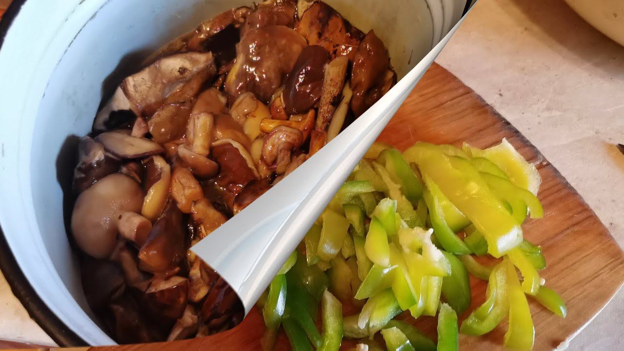 Слайд-шоу - грибное рагу с овощами Грибная солянка - обжаренные грибы тушеные с овощами в сметане. Овощи с огорода и грибы из леса за огородом 11 сентября 2023 Грибы смешанные: маслята, коричневый польский белый, настоящий белый, подосиновики, подберезовики, лисички. Собрал ведро, половину отдал соседке по огороду, часть отправил в рагу, часть забраковал, остальное замариновал. Овощи с грядок: чеснок, лук, сладкий перец, кабачок. Обжариваем чеснок и лук. Добавляем нарезанные грибы, обжариваем. Нарезаем сладкий красный перец, на видео он зеленый, извиняюсь - еще не покраснел, Красный Электрик тоже обижается. Солим. Тушим. Нарезаем кабачок. Солим. Тушим. Выливаем сметану и томатную пасту, тушим. *** В этом году помидоры не сажал под плёнку, убрал с открытого грунта зелеными с ведро, зафитофторили, половину отправил с дивана в ТКО. Потому и паста, а не живые помидоры в рагу. Специи.