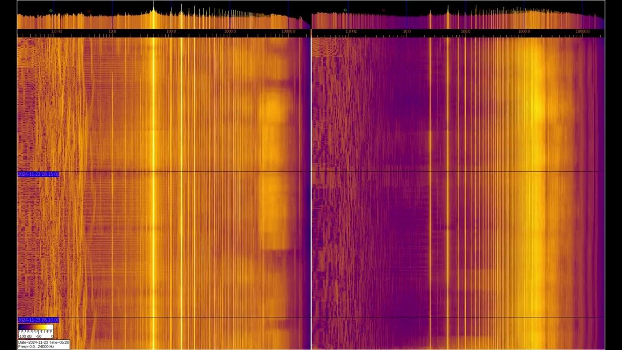 The left and right signals are taken from inductive sensors with ferromagnetic elements, but the left one is additionally connected to grounding on 2 stainless steel pins buried 1 m and spaced 1 m apart. You can see a large number of harmonics from the power supply and various artificial signals. Of interest are signals at frequencies below 50 Hz, where you can observe the operation of specialized equipment and communication signals of submarines and underground objects. Separately, it is worth considering signals in the region of 1-3 Hz on the left spectrum, which relate to the geomagnetic background, which is modulated by solar activity, They can be viewed in more detail in the video called “Signals from the Earth,” which are in the playlists below. The sound in the video is recorded in real time - a signal from sensors. О ПРОИСХОЖДЕНИИ ЧАСТОТНОЙ МОДУЛЯЦИИ СЕРПЕНТИННОЙ ЭМИССИИ https://youtu.be/bwWHggY1IVU?si=xAX1diRKI9MxQJ88&t=1740 Previous monitoring is in playlists: EMF monitor https://youtube.com/playlist?list=PLiRg2YCbXcwn41BHqADKVBep_TgVq6XUN Очень Низкая Частота ~ Very Low Frequency https://youtube.com/playlist?list=PLiRg2YCbXcwnp5DxM4PnSs7k_Rnypaqek SIGNALS IN THE GROUND https://youtube.com/playlist?list=PLiRg2YCbXcwl6f3Bf5arHbGSOCNE5U71O поддержать канал: 8-999-654-93-44