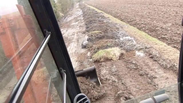 Вид из окна экскаватора на то, как работает ковш и капает земелю траншею