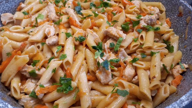 рецепт лук репчатый 1 шт. морковь 1 шт. помидоры 2 шт. мясо индейки 300 г соль,перец по вкусу макароны 300 г вода (кипяток) 800 мл. растительное масло для жарки зелень по желанию