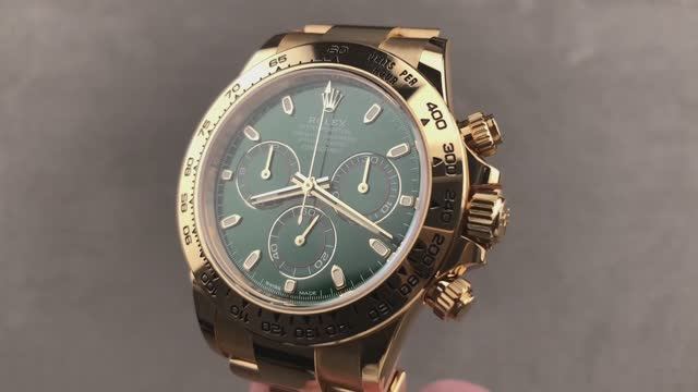 *видео переведено в Яндекс браузере… **данное видео для ознакомительного просмотра и не является предложением к продаже этих часов. Rolex Oyster Perpetual Cosmograph Daytona 116508 заключен в корпус 40 миллиметров из 18-каратного желтого золота, окружающий зеленый циферблат на браслете Oyster из 18-каратного желтого золота. Особенности этого Rolex Oyster Perpetual Cosmograph Daytona включают - часы, минуты, маленькие секунды и хронограф. Эти часы Rolex имеют толщину 12,4 мм и 46,5 мм от наконечника до наконечника. Для получения полной информации смотрите обзор Rolex Oyster Perpetual Cosmograph Daytona.