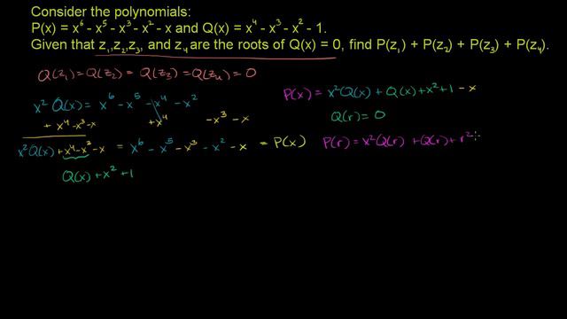 Courses on Khan Academy are always 100% free. Start practicing—and saving your progress—now: https://www.khanacademy.org/math/math-for-fun-and-glory/aime/2003-aime/v/2003-aime-ii-problem-9 Sum of polynomial evaluated at roots of another polynomial. Created by Sal Khan. Watch the next lesson: https://www.khanacademy.org/math/math-for-fun-and-glory/aime/2003-aime/v/2003-aime-ii-problem-10?utm_source=YT&utm_medium=Desc&utm_campaign=mathforfunandglory Missed the previous lesson? https://www.khanacademy.org/math/math-for-fun-and-glory/aime/2003-aime/v/sum-of-squares-of-polynomial-roots?utm_source=YT&utm_medium=Desc&utm_campaign=mathforfunandglory About Khan Academy: Khan Academy offers practice exercises, instructional videos, and a personalized learning dashboard that empower learners to study at their own pace in and outside of the classroom. We tackle math, science, computer programming, history, art history, economics, and more. Our math missions guide learners from kindergarten to calculus using state-of-the-art, adaptive technology that identifies strengths and learning gaps. We've also partnered with institutions like NASA, The Museum of Modern Art, The California Academy of Sciences, and MIT to offer specialized content. For free. For everyone. Forever. #YouCanLearnAnything Subscribe to Khan Academy’s Math For Fun and Glory channel: https://www.youtube.com/channel/UCrHuSfezaER8svQZiec1mIQ?sub_confirmation=1 Subscribe to Khan Academy: https://www.youtube.com/subscription_center?add_user=khanacademy