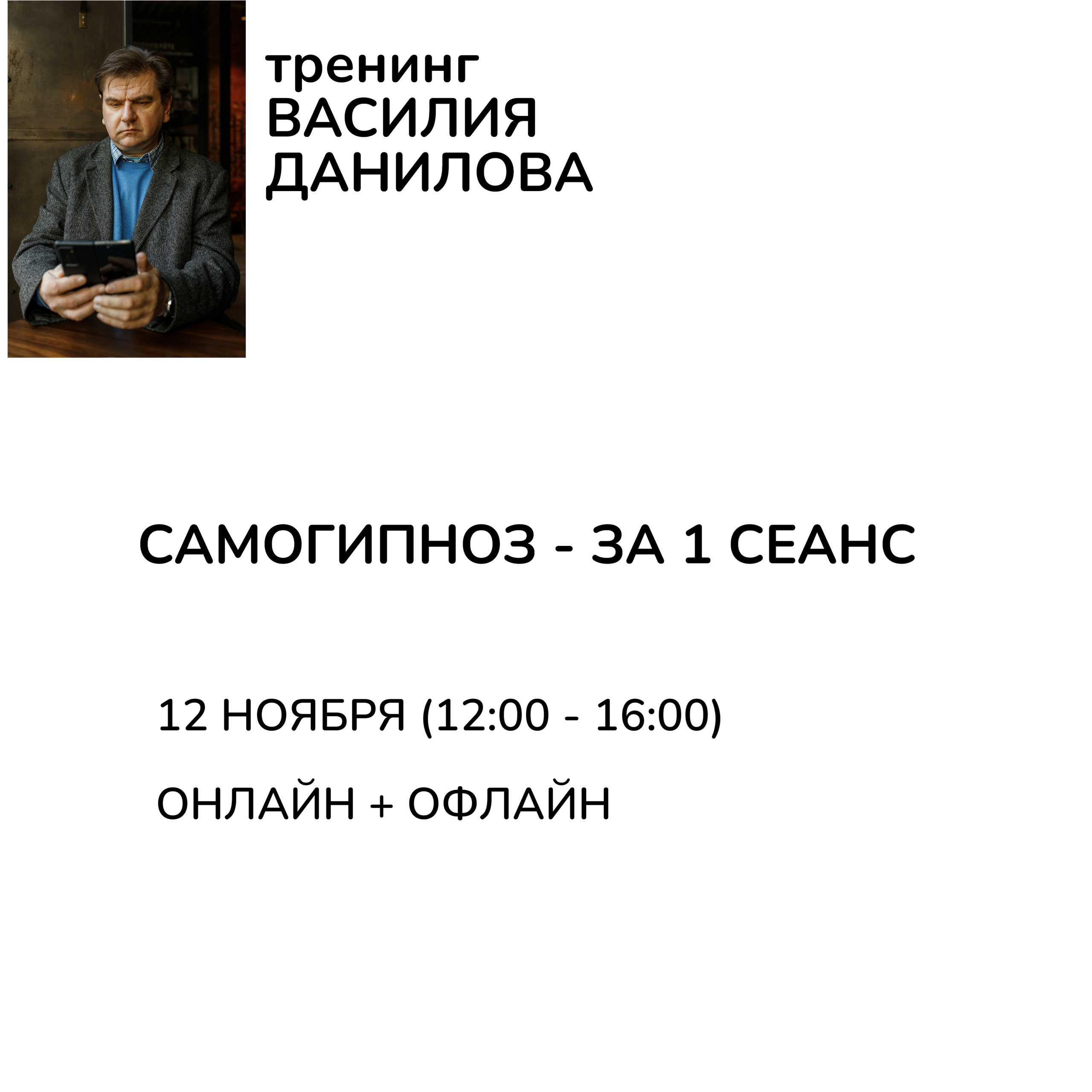 Самогипноз — за 1 сеанс Друзья! Планирую провести семинар и научить участников погружаться в самогипноз, а так же устанавливать систему самогипноза своим клиентам. Программа специализированная — подойдёт для психологов, коучей, гипнотерапевтов, которые хотят дать инструмент самогипноза своим клиентам. Программа пройдёт в 2-х форматах: - очно - онлайн Что будет на семинаре: - немного теории — как и почему работает самогипноз - проведём демонстрацию погружения для установки системы самогипноза - все участники получат скрипт и инструкции по погружению клиентов в самогипноз - набор установок, которые можно будет загружать в процессе самогипноза в начальный период использования - отвечу на вопросы по программе - для самых ленивых аудио запись погружения в самогипноз в моём исполнении /за отдельную плату/ После семинара: - у всех участников будет установлена система самогипноза - будет понимание и навык, как установить систему самогипноза другому человеку - раздаточный материал, чтобы ничего не забыть Дата проведения: 12 ноября начало в 12:00 Количество участников ограничено: очно — 4 места онлайн участники — 10 человек Продолжительность программы 2 — 3 часа Стоимость участия: очно — 25 т.р. онлайн — 10 т.р. Запись по тел: +7 916 696 00 98 Whatsapp: +7 916 696 00 98