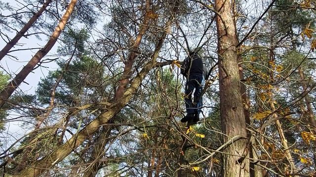 Спил макушки дерева ручной пилой. Спил макушки дерева ручной пилой.