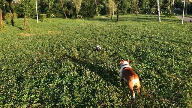 Английской бульдожке Черри подарили мяч с ручкой)).
