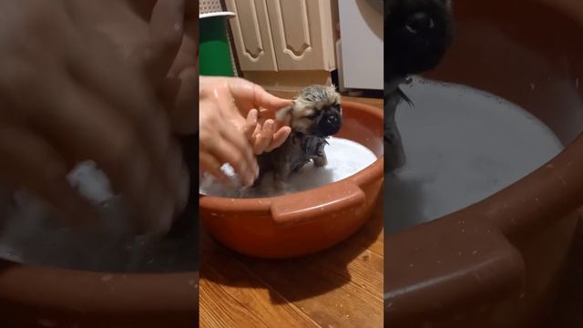 Мопс Бодя в первый раз принимает ванну