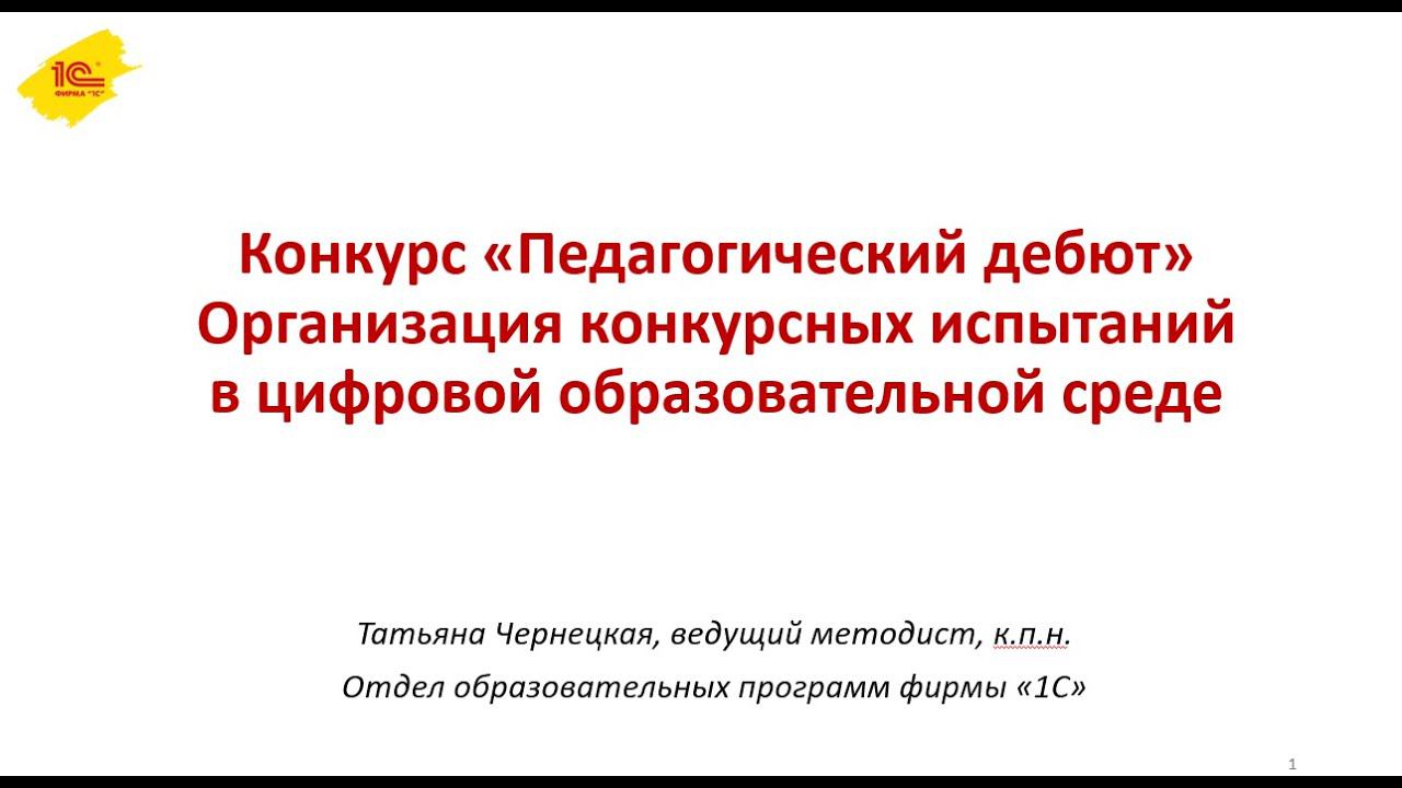 Видеозапись вебинара от 17 декабря 2020 г для участников конкурса "Педагогический дебют". Участники вебинара познакомились с возможностями цифровой образовательной среды конкурса, реализованной в системе "1С:Образование" Официальный сайт «1С:Образование» http://obrazovanie.1c.ru/education/cloud/