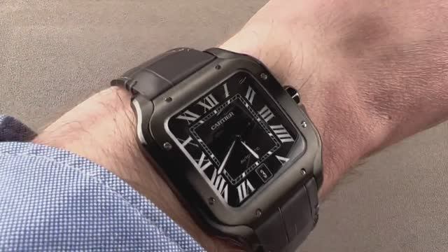 *перевести видео можно в Яндекс браузере Большие часы Cartier Santos De Cartier WSSA0039 толщиной 39,8 мм из черной нержавеющей стали ADLC обрамляют черный циферблат на сером ремешке из кожи аллигатора. Часы Cartier Santos De Cartier Large оснащены такими функциями, как часы, минуты, секунды и дата. Толщина этих часов Cartier также составляет 9,5 мм, а расстояние от выступа до выступа составляет 47,7 мм. Для получения более подробной информации ознакомьтесь с полным обзором Cartier Santos De Cartier.