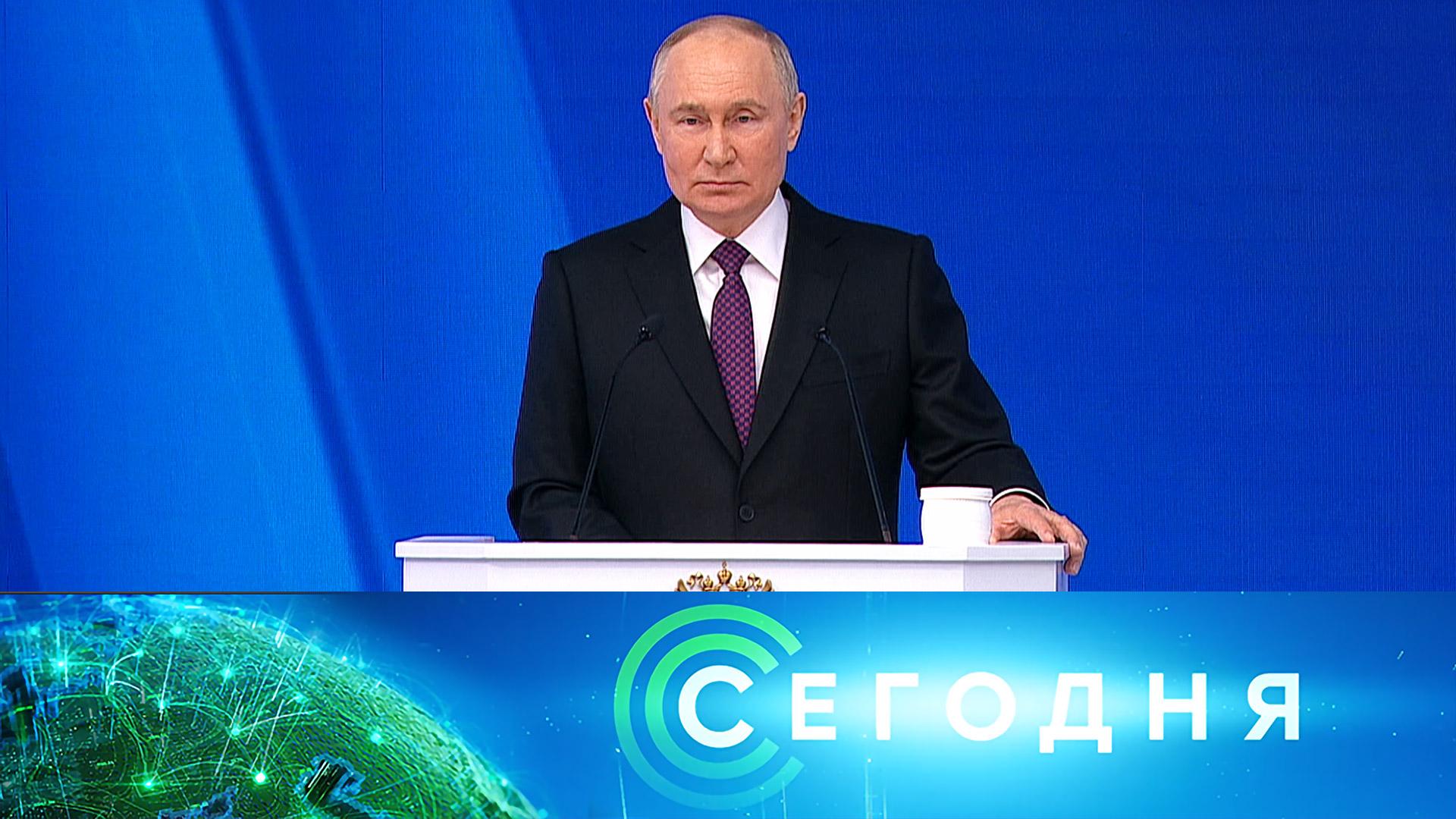 00:00 В этом выпуске 00:39 Приоритет внутренней политике: главные тезисы послания Владимира Путина. 21:15 Послание Владимира Путина Федеральному собранию показали бесплатно в 20 городах России. 22:00 Российские военные уничтожили диверсионную группу в Херсонской области. 22:51 Заключение врача: Джо Байден в состоянии исполнять обязанности президента. 24:17 С Восточного стартовала ракета «Союз-2.1б». 25:07 Эксперты прогнозируют рост цен на шоколад и его ингредиенты. 30:12 Фонд «Круг добра» дает шанс детям с орфанными заболеваниями. Больше новостей — в Telegram. Подписывайтесь: https://t.me/ntvnews Смотрите все выпуски «Сегодня» на RUTUBE: https://rutube.ru/plst/53542/