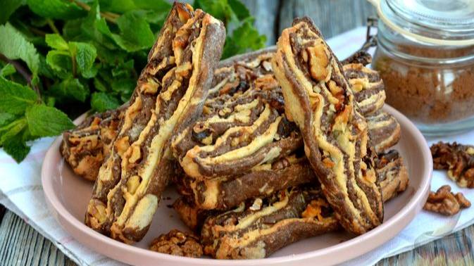 Полосатое печенье приготовить несложно, для этого понадобится два вида песочного теста: светлое и тёмное шоколадное. Формируется печенье из уложенных друг на друга пластов теста с добавлением грецких орехов. #Печенье #ПесочноеПеченье #ПолосатоеПеченье #ПеченьеСОрехами
