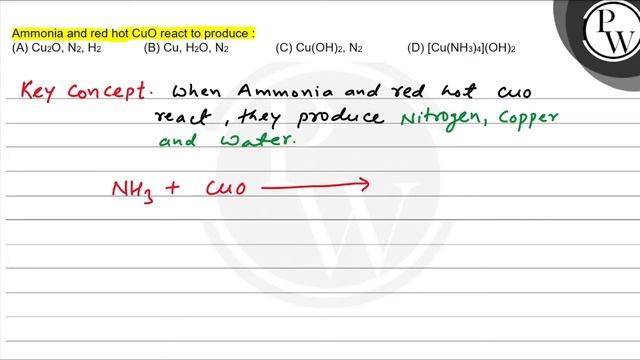 Ammonia and red hot \( \mathrm{CuO} \) react to produce: \( \mathrm{P} \) (A) \( \mathrm{Cu}_{2} \mathrm{O}, \mathrm{N}_{2}, \mathrm{H}_{2} \) (B) \( \mathrm{Cu}, \mathrm{H}_{2} \mathrm{O}, \mathrm{N}_{2} \) (C) \( \mathrm{Cu}(\mathrm{OH})_{2}, \mathrm{~N}_{2} \) (D) \( \left[\mathrm{Cu}\left(\mathrm{NH}_{3}\right) 4\right](\mathrm{OH})_{2} \) W 📲PW App Link - https://bit.ly/YTAI_PWAP 🌐PW Website - https://www.pw.live