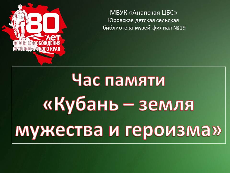 Сегодня, 9 октября 2023 года, Кубань отмечает памятную дату - День освобождения от немецко-фашистских захватчиков. Освобождение Краснодарского края началось 21 января 1943 года с Успенского района. Полностью Краснодарский край был освобожден от гитлеровских войск к 9 октября 1943 года, когда последних оккупантов прогнали с Таманского полуострова. Оккупация Краснодарского края продолжалась 422 дня, но при этом край никогда не был оккупирован полностью. Мы помним! Мы гордимся и склоняем головы перед всеми, кто стойко переносил тяготы войны, сражался за Краснодарский край, вернул свободу и мир на нашу родную землю! Подготовлено главным библиотекарем Юровской детской сельской библиотеки-музея-филиала №19 И.А. Матюшовой