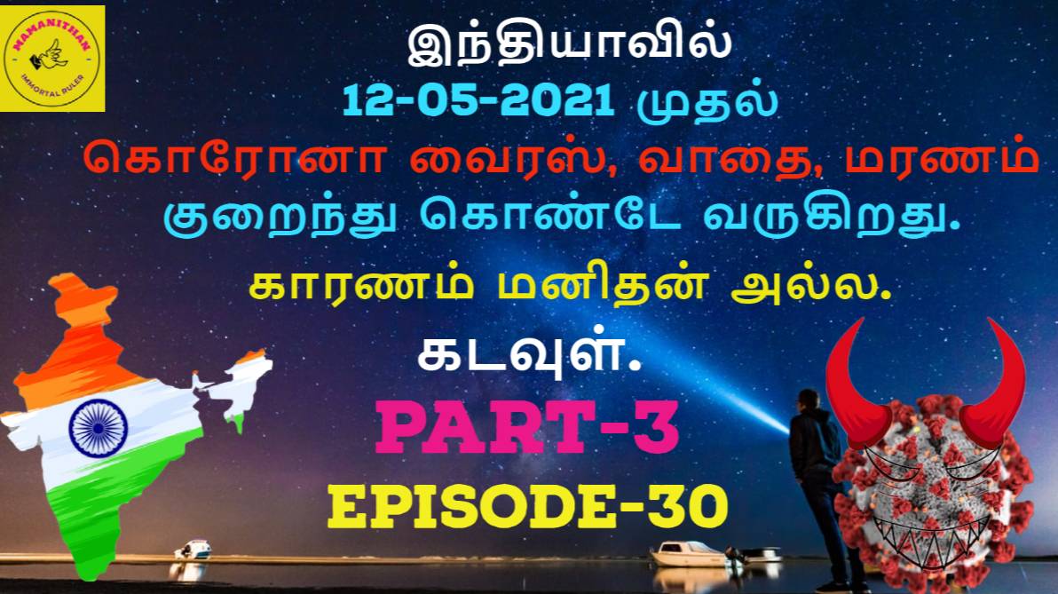 In India, corona virus, disease, death has been declining from 12-05-2021. Reason is not human. God. இந்தியாவில், 12-05-2021 முதல் கொரோனா வைரஸ் வாதை, மரணம் குறைந்து கொண்டே வருகிறது. காரணம் மனிதன் அல்ல. கடவுள். PART-3 #NOSTRADAMUS #MAMANITHAN #IMMORTALRULER #India #Coronavirus #Disease #Death #Declining #12-05-2021 #Reason #NotHuman #God EPISODE-30 - PART-3 14-02-2025