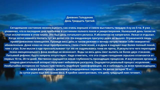 Дневник 40 дневного голодания. День Тридцать Третий. Сегодняшнее состояние можно оценить как очень хорошее и смело выставить твердую 4-ку из 5-ти. Я уже упоминал, что в последние дни пребываю в состоянии полного покоя и умиротворения. Нынешний день также не стал исключением в этом плане. Это был день тотального релакса. Я абсолютно не напрягался. Лежал и отдыхал. Когда хотел немного поспать тут же делал это. На ежедневную прогулку даже не вышел. Ограничился лишь проветриванием помещения. Проведя весь день в таком режиме к вечеру почувствовал себя невероятно обновленным. Даже кожа на лице преобразилась, глаза стали яснее, а в душе я ощущал еще более полный покой, чем с утра. Если мысли о еде проскальзывают тут же не задумываясь гоню их прочь. В результате чего перепадов психо-эмоционального фона вообще не возникает. Воды за весь день смог выпить не более двух стаканов. Питьевой рефлекс будто напрочь отсутствует. Надо отметить, что эта стадия голодания серьезно отличается от первых 10-ти, 20-ти дней. Явственно ощущается некая глубинность проходящих процессов. И внутренние органы и опорно-двигательный аппарат получают небывалую разгрузку. Ощущается реальный процесс исцеления. Необычайно интересно не только чувствовать подобную трансформацию, но и наблюдать за всем происходящим, а также фиксировать динамику каждодневных перемен. На весах сегодня 75 кг. За сутки ушло еще 500 грамм веса. Я крайне заинтригован, что день грядущий нам готовит. #очищениеорганизма #голоданиенаводе #длительноеголодание
