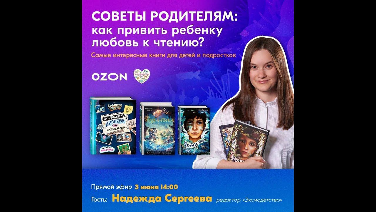 Советы родителям от редактора «Эксмодетство»: как привить ребенку любовь к чтению? А также самые интересные книги для детей и подростков. Прямой эфир на Ozon.ru. с Надеждой Сергеевой, редактором детских и подростковых книг. (от 03.06.2022) Вместе с Надеждой поговорим про самые интересные книги серии «Гравити Фолз», «Дети леса», «Дети моря», «Таинственная посылка» и другие, редактор расскажет, как привить ребенку любовь к чтению, какие книги точно понравятся, и что сейчас популярно в детской и подростковой литературе!