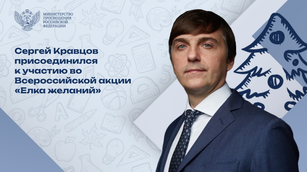 Сергей Кравцов принял участие в новогодней акции «Елка желаний». Министр просвещения пообещал выполнить новогоднее желание Даниила из Оренбургской области и подарить ему аэрохоккей.  Кроме того, министр обещал показать Ангелине из Свердловской области Московский зоопарк. С наступающим Новым 2024 годом! Пусть сбываются мечты!