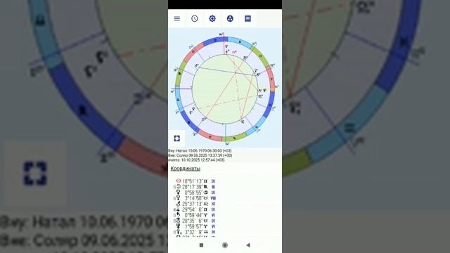 Краткая инструкция по построению Соляров в приложении для построения гороскопов Сотис для Андроид. Рассмотрен пример построения Соляра. Текст инструкции: Видео, которое вы сейчас смотрите, это краткая инструкция использования соляров в приложении Сотис под Андроид. Соляр, почти всегда, строят на координаты места, где находится кверент в момент его включения, а т.к. программа для расчета Солярной карты берет координаты из карты События, то именно в карте События, нам и надо установить координаты для Солярной карты. Заходим в Меню, выбираем Изменить данные события, далее есть два варианта: найти населенный пункт, где было включение Соляра или ввести координаты вручную. Далее надо ввести дату того периода, на который мы строим соляр. Например если дата рождения 10 июня и нужен соляр на 2020 год, то дату можно ввести на любую дату позже дня рождения. Если нужен Соляр на 2019 год, то берем любую дату до дня рождения 2020 года. Если анализируется текущая дата и она уже установлена в карте События, то можно вообще ничего не менять а сразу выбрать тип карты Соляр. Нажимаем третью кнопку слева верхнего ряда, с изображением звездочки и ищем в списке Соляр, нажимаем и выбираем сочетание, какие карты нужны для анализа. Обычно начинают анализ Соляра с двойной карты Соляр-Натал. Это первый пункт. Если необходимо исследовать только одну карту, то выбираем какую, внешнюю или внутреннюю. Для этого в верхнем ряду есть кнопка с изображение круга с тремя точками. Если есть необходимость исследовать Прогрессию к Соляру или транзит к Соляру, то при выборе Солярной карты выбираем соответствующий пункт. Сол-Тр - это Транзит ная карта к Солярной карте, Сол-Пр - Прогрессия третичная к Солярной карте и ПрСол-Нат - это прогрессия Солярной карты к Натальной. - это сочетание редко используется, но оно было добавлено по просьбе пользователей. При использовании Динамики времени для исследования разных временных периодов, нет необходимости специально менять данные для Соляра. Он автоматически будет пересчитываться на дату события, которая меняется в динамике времени. Это особенно актуально, когда вы меняете пошагово время и добрались до той точки, когда текущий соляр закончился и действует уже другой. Программа сама об этом позаботится и перестроит карту Соляра, взяв тот, который нужно. Если что-то из построения Соляров осталось непонятным, пожалуйста напишите мне на почту и я вам отвечу и добавлю эту информацию в видео инструкцию. Благодарю за внимание.
