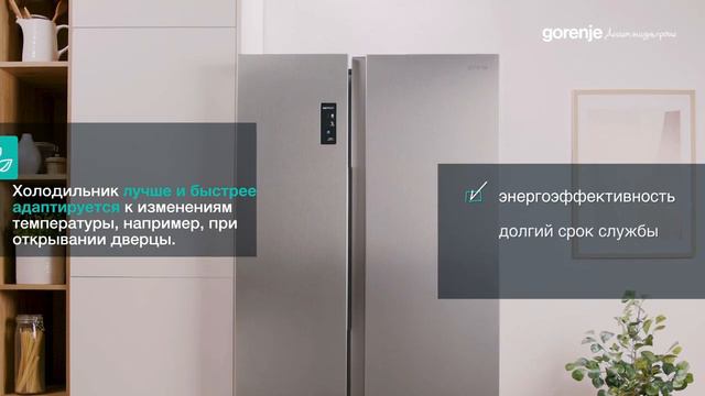 Каждое открывание холодильника меняет температурный режим внутри. Однако у проблемы есть решение: инверторный компрессор Gorenje обеспечивает быстрое и эффективное охлаждение. Так что, если вы часто заглядываете в холодильник за вкусностями, этот вариант для вас. К тому же инверторный компрессор служит дольше, работает тише и экономно расходует энергию.