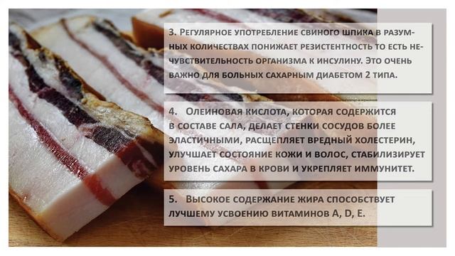 Можно ли употреблять сало при сахарном диабете? Сахарный диабет – заболевание, при котором пациенту обязательно необходимо придерживаться диеты и следить за качеством своего рациона. Но это совсем не означает, что нужно отказываться от аппетитных вкусностей. Сало – высококалорийный продукт, который на 90% состоит из жиров животного происхождения и практически не содержит в себе углеводов (всего 1.4 г на 100 г сала). Поэтому оно не вызывает повышение уровня глюкозы крови при сахарном диабете 1 и 2 типа. Полезные свойства сала для пациентов с сахарным диабетом В составе сала содержится арахидоновая кислота, которая отвечает за нормализацию работы желудочно-кишечного тракта и почек, регулирует кровообращение. Животный жир без вредных примесей укрепляет стенки сосудов и понижает уровень холестерина. Регулярное употребление свиного шпика в разумных количествах понижает резистентность то есть нечувствительность организма к инсулину. Это очень важно для больных сахарным диабетом 2 типа. Олеиновая кислота, которая содержится в составе сала, делает стенки сосудов более эластичными, расщепляет вредный холестерин, улучшает состояние кожи и волос, стабилизирует уровень сахара в крови и укрепляет иммунитет. Высокое содержание жира способствует лучшему усвоению витаминов A, D, E. Правила употребления сала при сахарном диабете Для людей с сахарным диабетом 1 типа нет особых ограничений в употреблении шпика. Таким пациентам можно съедать по 20-40 г сала ежедневно без ущерба для здоровья. При диабете 2 типа следует ограничить потребление жиров. Тут все зависит от наличия у пациента лишнего веса. Если у человека нарушен липидный обмен, есть ожирение и никак не получается сбросить несколько килограмм, то от сала лучше отказаться. В остальных случаях можно съедать 20-40 г сала 2-3 раза в неделю. Сало лучше употреблять сырым, слабосоленым, обязательно приготовленным собственноручно. Можно его комбинировать с черным или серым хлебом, злаковыми хлебцами. При склонности к набору веса хлеб лучше заменить на зеленые овощи. Чего лучше избегать: - Копченого и жареного сала - Покупного сала, в нем слишком много соли и специй - Не стоит комбинировать сало с продуктами содержащими большое количество углеводов таких как картофель или макароны. - Употребления сала с алкоголем. Людям с сахарным диабетом можно и даже нужно включить сало в свой рацион, но при этом важно не забывать придерживаться простых правил, следить за самочувствием, весом и уровнем сахара в крови. Ролик подготовлен на основе материалов сайта он-лайн школы диабета http://5mmol.club При подготовке ролика были использваны маетриалы: Фото href = "https://pixnio.com/ru/media/ru-2146693" Bicanski oт href = https://pixnio.com/ru/ Pixnio Photo by form PxHere В Советское время сало солили только так! Просто и вку?