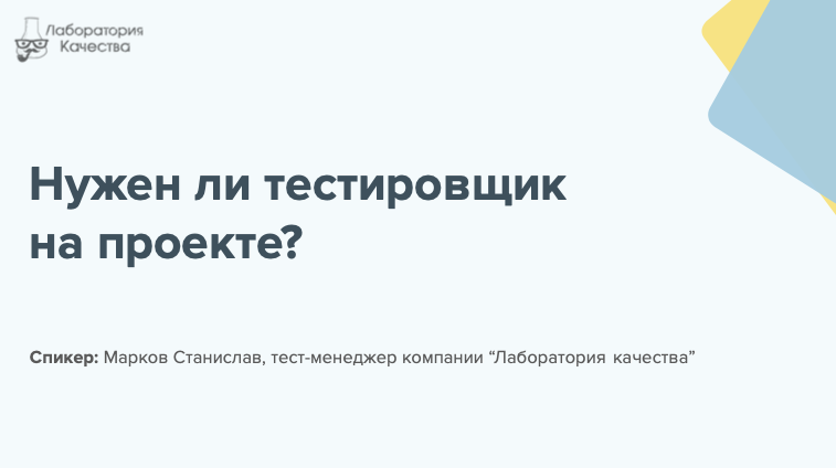 В данном видео Станислав Марков, тест-менеджер компании "Лаборатория качества", рассуждает о том, нужен ли тестировщик на проекте, разбирая этот вопрос детально. Смотрите нас также на YouTube-канале: www.youtube.com/channel/UCUKj7hvw6phelqZPKKJnGBQ