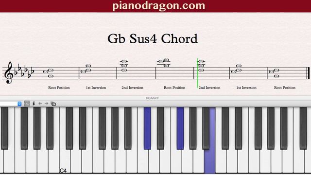 Gb Sus4 Chord Root position, 1st and 2nd inversion on piano.