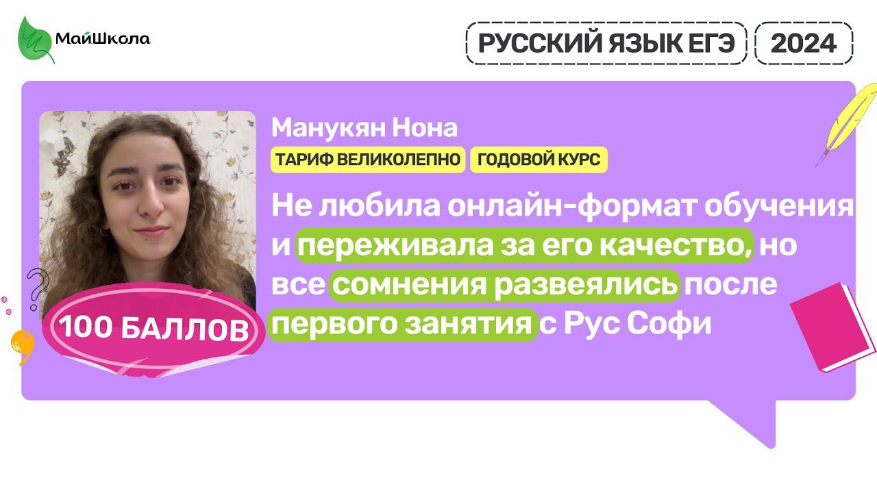 Манукян Нона. 100 баллов ЕГЭ 2024 | МайШкола #егэ #русскийязык Записывайся на актуальные курсы подготовки к ЕГЭ по Русскому языку здесь: https://clck.ru/359pZC МайШкола это: - Опытные преподаватели, которые в совершенстве знают структуру ЕГЭ и каждый год сдают ЕГЭ по своему предмету, чтобы почувствовать себя на месте ученика - У нас авторская программа подготовки, показавшая свою эффективность на результатах ЕГЭ более 3000 учеников - 88 – средний балл учеников на ЕГЭ по Русскому языку Подписывайся на канал, чтобы не пропустить новые видео и эфиры! https://www.youtube.com/channel/UC6QrLx01kmc7kLt4fnl_s6Q ► Инстаграм Юлии: https://www.instagram.com/rus_sofi ► Телеграм-канал: https://t.me/rus_sofi ► Группа ВК: https://vk.com/public184420530