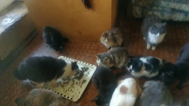 Котики едят со всех тарелочек и пьют водичку из больших ёмкостей