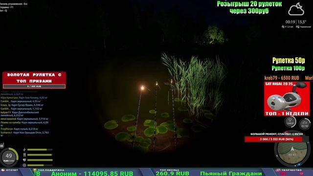 Поддержка донатом https://new.donatepay.ru/@1032463 Альтернативный донат https://www.donationalerts.com/r/kalyamba11 5536913964533059 карта Тинькоф Если стрим лагает,смотри стрим на трово https://trovo.live/s/Kalyamba_na_Ribalke Тг https://t.me/kalyamba_na_ribalke Мой ВК - https://vk.com/kalyantv НИК в игре kalyan11 НАШ ДС https://discord.gg/4ZzSQkQtsK Заказ водоема на 1 час - 500р ( весь стрим 2500р ) Модерка на канале 1300р ( каждая следующая на 100р больше) ✅Призы в рулетке "ЗОЛОТАЯ" 500р ✔ ЗОЛОТО ✔ ПРЕМ ✔ КАТУШКИ РАПТОР 40, ВЕНГИ, ТАЙГА, СИЛЬВЕР 80, И другие ✔ ПАЛКИ ПИЛКЕРНАЯ, ДОНКА МОРСКИЕ, ✔ РОД ПОД, СТУЛЬЯ ✅Призы в рулетке СТАНДАРТ : 100р ✔ катушкИ РАПТОР 40, ВЕНГИ, ТАЙГА, СИЛЬВЕР 80, И другие ✔ катушки 60 для медного ( ЭВИИ, НАТОРЫ, ГОЛДА, и тд) ✔ ПИЛКЕРНОЕ УДИЛИЩЕ КОРОЛЕВА ОКЕАНА ✔ Морское Донное удилище ✔ прем ( 3, 7, 30 дней) ✔ золото ( 1, 3, 5, 10, 20 ,50) ✔ билет на море ( 1, 3, 5 дней) ✔ голд наживка и др. ✅Призы в рулетке "СТАРТОВАЯ" 50р ✔ катушка Венга ✔ катушка "silver80" ✔ катушка "БЕЛЫЙ КАЛИБР" ✔ катушка "Черный калибр" ✔ катушка "Протон" ✔ катушка "Нарга 6000" ✔ Набор Фидерист и спинингист ✔ Карповик Фортуна ✔ фидерные удилища ✔ прем, золото, алкашка, наживки и тд P.s Рулетка это не казино, а награда за поддержку стримера. Вечный ТОП ПОДДЕРЖКИ (10.06.2025) 1. Леха сварной 214 572 2. Dimon_pokemonchik 127 034 3. Skreb79 103 061 4. Interceptor 96 230 5. FishRus86 82 500
