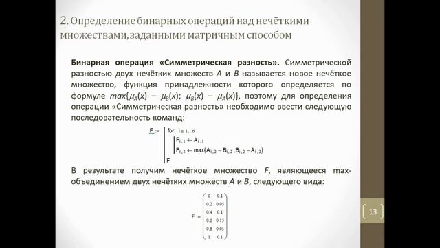 В видео рассмотрено три способа реализации в математическом пакете Mathcad бинарных операций над нечёткими множествами: 1. Определение бинарных операций над нечёткими множествами, заданными табличным способом. В этом разделе показана программа в Mathcad, реализующая табличное и графическое представления для операций объединения и пересечения нечётких множеств X и Y. 2. Определение бинарных операций над нечёткими множествами, заданными матричным способом. Представлена реализация следующих бинарных операций: a) «Min-пересечение»; b) «Max-объединение»; c) «Алгебраическое пересечение»; d) «Алгебраическое объединение»; i) «Граничное пересечение»; f) «Граничное объединение»; g) «Разность»; h) «Симметрическая разность». 3.Определение бинарных операций над нечёткими множествами, заданными аналитическим представлением. Представлена реализация нескольких операций с демонстрацией их графического представления в Mathcad: 1) max-объединение; 2) min-пересечение; 3) алгебраическое объединение и пересечение; 4) граничное объединение и пересечение; 5) разность; 6) симметрическая разность; 7) объединение и пересечение Гамахера; 8) объединение и пересечение Эйнштейна; 9) усиленное объединение и пересечение; 10) оператор объединения и пересечения Ягера; 11) дизъюнктивная сумма. --------------------------------------------------------------------------------------- Содержание: 00:00 Вступление 00:12 Табличный способ 01:13 Матричный способ 04:35 Аналитическое представление 08:29 Концовка --------------------------------------------------------------------------------------- Работа выполнена студенткой МГУ им. адм. Г.И. Невельского (г. Владивосток) К.Д.А. --------------------------------------------------------------------------------------- Видео также опубликовано на Яндекс.Дзен канале "Самостоятельная работа": https://zen.yandex.ru/independent_work/