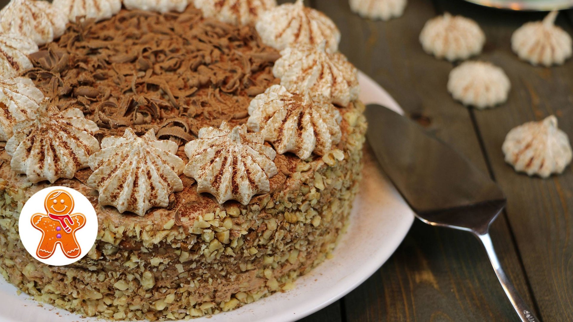 Для теста: 50 г муки 6 желтков 5 белков 20 г крахмала 15 г какао-порошка 30 мл горячей воды 130 г сахара Для крема: 200 г шоколада 500 мл сливок 33-35% Для пропитки: 3 ст. ложки воды 2 ст. ложки сахара 1 ст. ложка коньяка Для безе: 1 белок 50 г сахара 0,5 ч. ложки какао-порошка Для украшения: какао, орехи, шоколад Вес торта - 1,1 кг