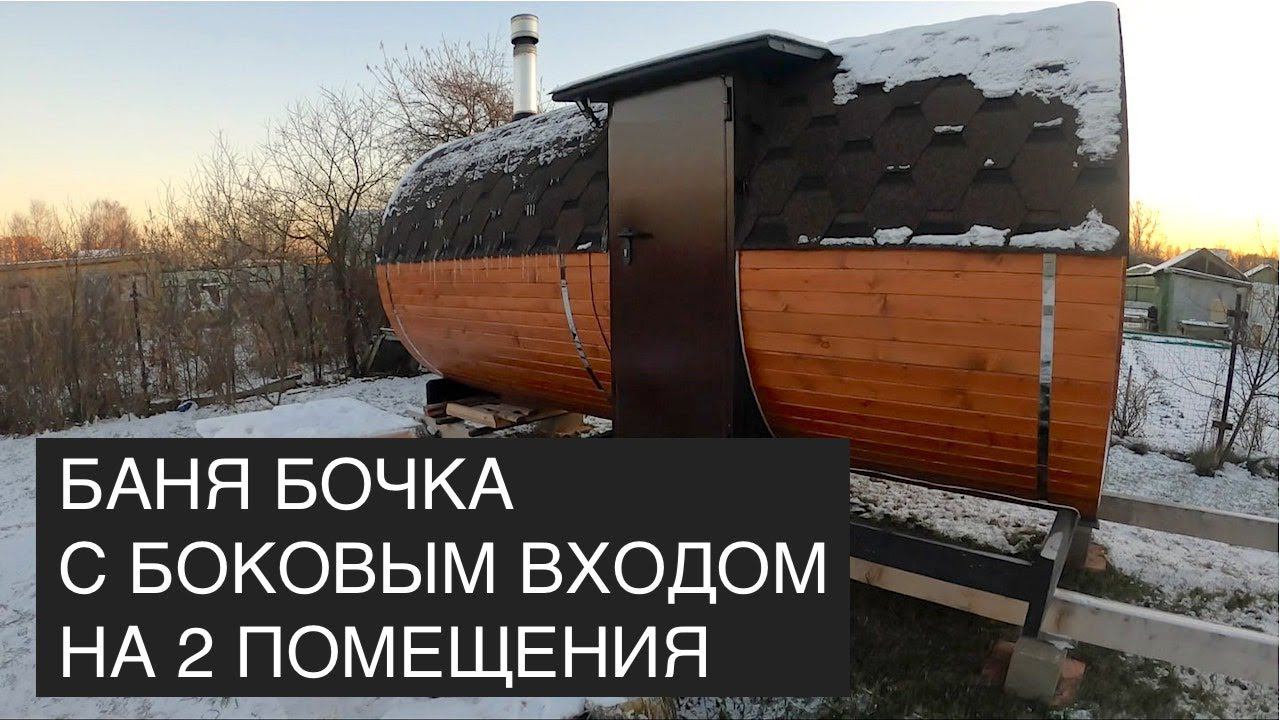 Баня бочка 4,7*2,15 метра. Боковой вход. Железная дверь. Парная + комната отдыха. Модель Мега-2 СВ