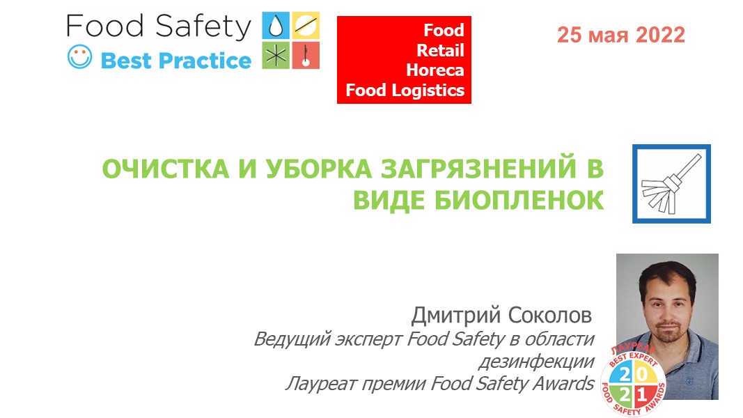 Дмитрий Соколов, ведущий эксперт Food Safety в области дезинфекции, Лауреат премии Food Safety Awards, рассказывает о технологии мойки на пищевых предприятиях, препятствующей образованию биоплёнок. Кроме того, рассматривается процесс трёхэтапной обработки с применением энзимов, дезинфицирующих препаратов и специальных индикаторов