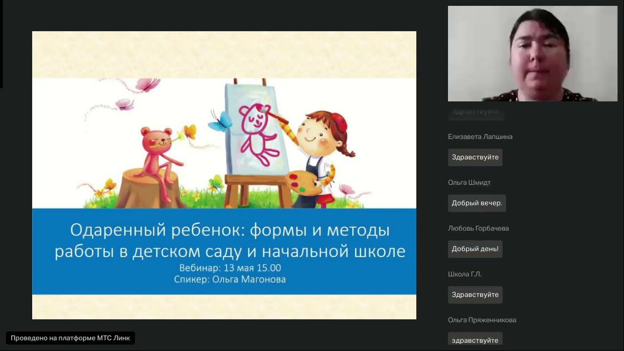Одаренный ребенок: формы и методы работы в детском саду и начальной школе Дата проведения: 13.05.2024 Время: 15:00 МСК Вебинар ведет Ольга Магонова: педагог-психолог, заведующая отделом по работе с детьми-инвалидами и детьми с ОВЗ. Одаренные дети имеют выдающиеся способности и таланты, которые требуют особого подхода со стороны педагогов и воспитателей. В ходе вебинара мы рассмотрим, как распознать одаренного ребенка, какие особенности его развития нужно учитывать, а также какие методы и формы работы помогут раскрыть его потенциал в детском саду и начальной школе. На вебинаре мы обсудим следующие вопросы: - Какие характеристики свойственны одаренным детям и как их можно выявить? - Какие методы и формы работы помогут стимулировать умственное развитие одаренных детей? - Как создать комфортную образовательную среду для одаренных детей в детском саду и начальной школе? Приглашаем всех педагогов и воспитателей, которые заботятся о развитии каждого ребенка, присоединиться к нашему вебинару и узнать новые методики и подходы к работе с одаренными детьми. Наш портал «Педагоги России» — бесплатные вебинары: http://veb.pedrus.ru/ Приобрести сертификат можно тут: https://veb.pedrus.ru/zayavka/?id=1632