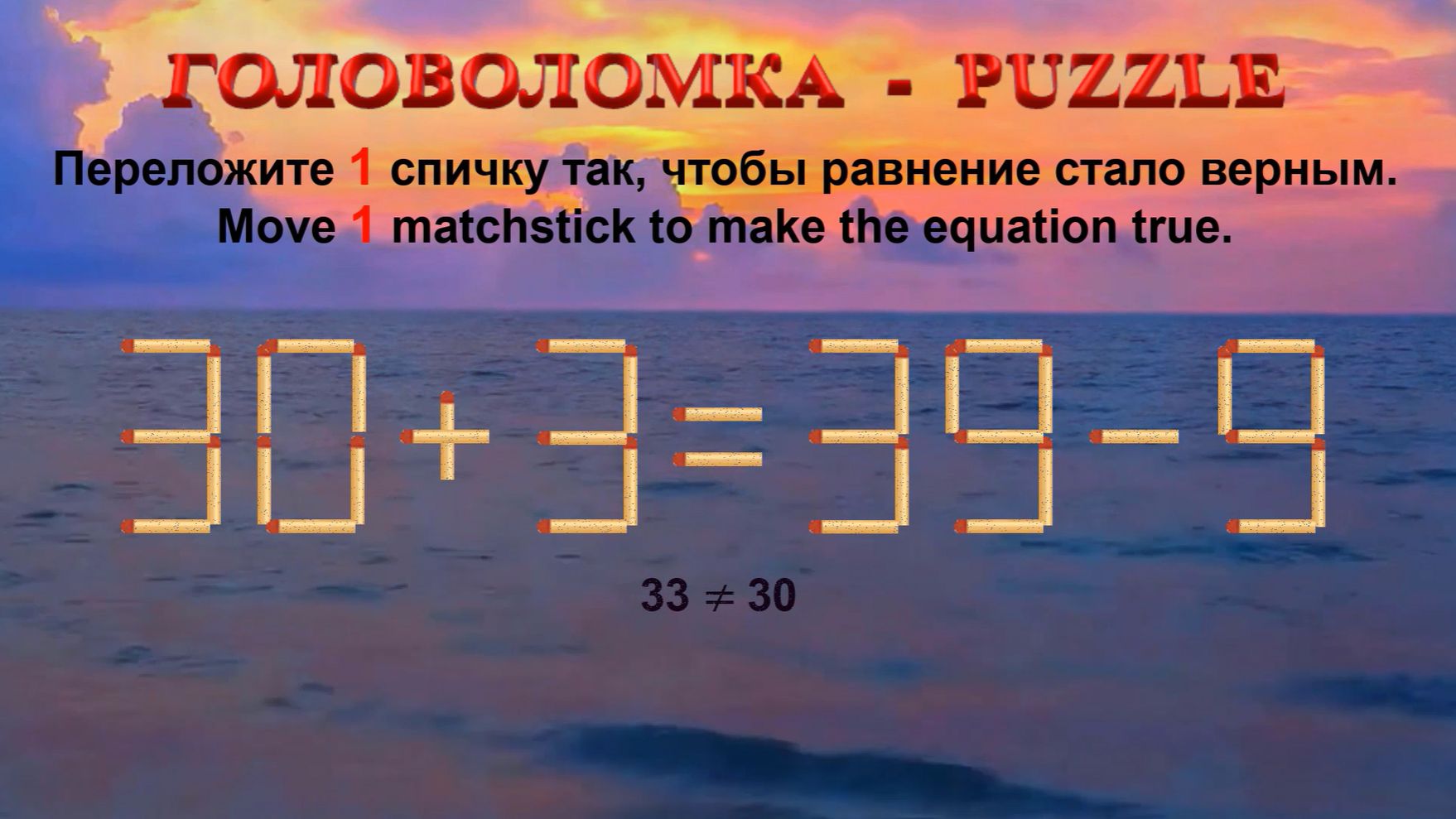 ГОЛОВОЛОМКА – PUZZLE. Спичка. 30+3≠39-9, 35+2≠40-2, 52+6≠65-6, 58+5≠69-4