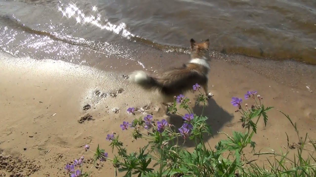 Собака шелти Лета. бегает за волнами лето 2020