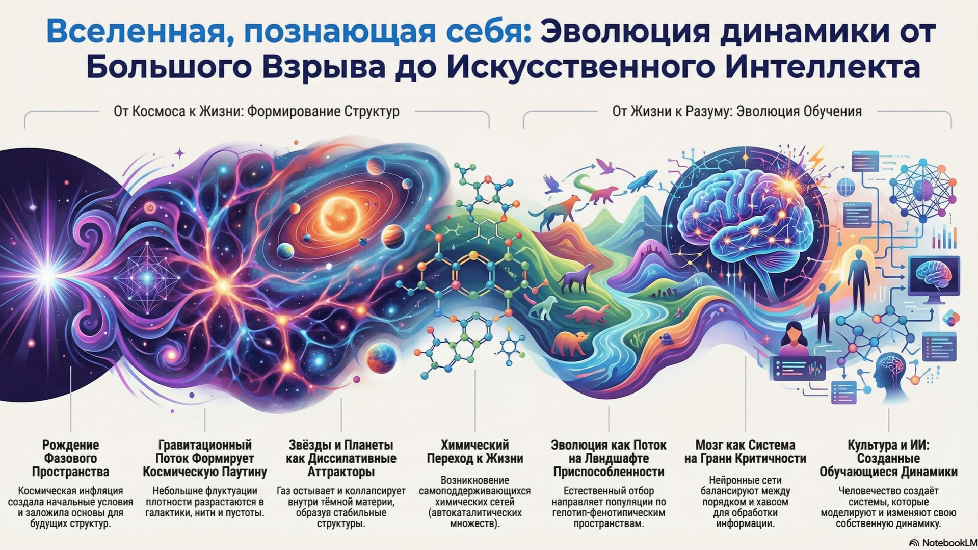 Вселенная, обучающаяся самой себе: Об эволюции динамики от Большого взрыва до машинного интеллекта Этот документ представляет собой унифицированное динамическое системное описание эволюции Вселенной от Большого взрыва до машинного интеллекта. Он рассматривает традиционно разрозненные научные области, такие как космология, биология и ИИ, не как отдельные, а как последовательные режимы динамики в постоянно обогащающихся пространствах состояний, связанных фазовыми переходами и возникающими аттракторами. Повествование начинается с динамики инфляционного поля и гравитационной нестабильности, формирующих космическую паутину, продолжается диссипативным коллапсом, образующим звезды и планеты, и появлением долгоживущих геохимических аттракторов. В рамках этих аттракторов зарождение жизни рассматривается как самоподдерживающиеся реакционные сети, а эволюционная биология — как потоки на многомерных многообразиях. Мозги интерпретируются как адаптивные динамические системы, функционирующие вблизи критических поверхностей, в то время как человеческая культура, технологии и современный ИИ представляют собой символическую динамику и спроектированные обучающиеся потоки, которые рекурсивно перестраивают свои собственные фазовые пространства. В документе подчеркиваются повторяющиеся математические мотивы, такие как нестабильность, бифуркация и многомасштабная связь на протяжении всей этой эволюционной траектории. Основная цель — предложить межмасштабную теоретическую перспективу, интерпретирующую историю Вселенной как эволюцию самой динамики, кульминацией которой являются системы, способные моделировать и изменять свое будущее. #ЭволюцияВселенной #ДинамическиеСистемы #ОтБольшогоВзрываДоИИ #МашинныйИнтеллект #МежмасштабныйАнализ #ФормированиеСтруктур #ТеоретическаяПерспектива документ - https://arxiv.org/pdf/2512.16515v1 подписаться - https://t.me/arxivpaperu отправить донаты: USDT: 0xAA7B976c6A9A7ccC97A3B55B7fb353b6Cc8D1ef7 BTC: bc1q8972egrt38f5ye5klv3yye0996k2jjsz2zthpr ETH: 0xAA7B976c6A9A7ccC97A3B55B7fb353b6Cc8D1ef7 SOL: DXnz1nd6oVm7evDJk25Z2wFSstEH8mcA1dzWDCVjUj9e создано с помощью NotebookLM