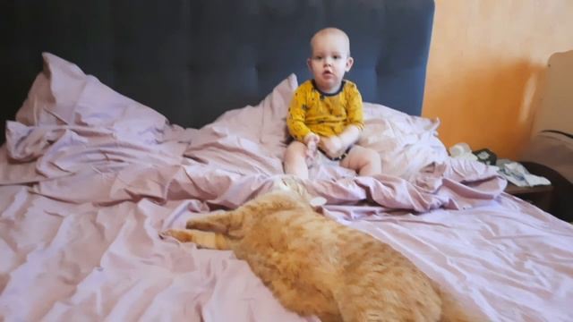 малыш играет с кисой