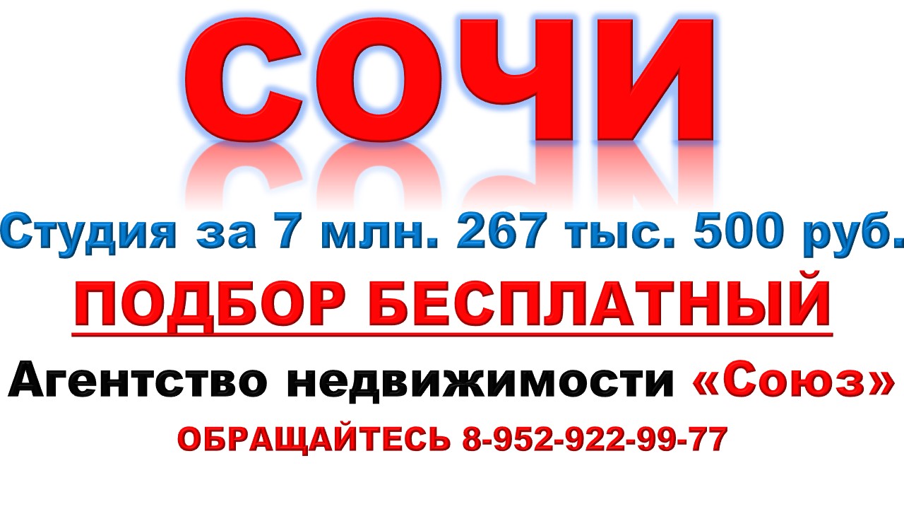 Агентство недвижимости «СОЮЗ» Ваш агент по новостройкам Евгений 89529229977 (WhatsApp) Цена на квартиру точно такая же как и у застройщика. Квартира продаётся БЕЗ РИЭЛТОРСКОЙ КОМИССИИ !!!. Покупайте: квартиру в Сочи. Новый Сочи мкр. Цена: 7 млн. 267 тыс. 500 руб. Первоначальный взнос: 1 млн. 460 тыс. 767 руб. Ежемесячный платеж: 44 817 руб. при ставке 8% Площадь общая: 32,3 м2 Площадь кухни: 6,46 м2 Срок сдачи: 4 квартал 2023 Договор: К-П Тип дома: Блочный Тип отделки: Подготовка под чистовую отделку Потолки: 3м. Преимущества: Транспортная доступность. Развитая инфраструктура. Коммуникации. Благоустроенная закрытая территория. Паркинг. Клубный дом расположен в 10 минутах от центра города, в микрорайоне Новый Сочи, рядом с крупными курортами и зелеными зонами. Удобная транспортная развязка обеспечивает хорошее сообщение с другими районами города. Микрорайон Новый Сочи имеет хорошо развитую инфраструктуру со с школами, детскими садами, банками, ресторанами и т.д. Также есть бизнес-центр и магазины. В доступности находится 3 общеобразовательные школы, частная школа «Mba school», авторская школа «Ступеньки». В пешей доступности как минимум 6 продуктовых магазинов и супермаркет «Магнит». Большинство пляжей микрорайона открыты для всех, есть также и закрытые пляжи с платным входом. Из достопримечательностей Нового Сочи можно отметить правительственную дачу «Бочаров ручей», а также Собор Святого Владимира. Рекомендуем подписаться на канал. Благодарим ВАС !!!