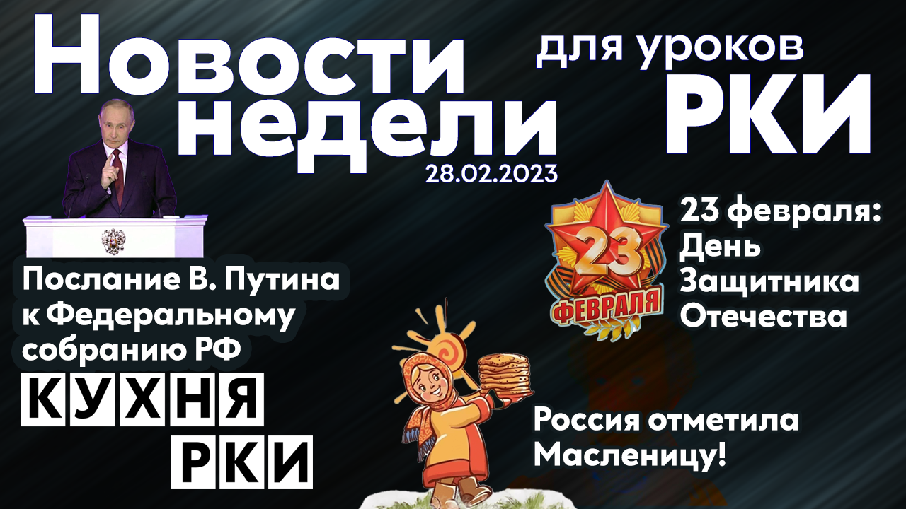 Что интересного и важного произошло в России за прошедшую неделю? Делимся в нашем новом выпуске новостей! 00:00 Послание В. Путина к Федеральному собранию РФ (В1+) 04:05 23 февраля отмечают День Защитника Отечества (А2) 05:05 Поздравление В. Путина с 23 февраля (А2) 07:17 Россия отметила Масленицу! (А2) В наших рабочих листах вы найдете упражнения, снимающие лексические и лингвострановедческие трудности, интересные речевые и коммуникативные упражнения, а также упражнения с русскими поговорками и пословицами и упражнения на формирование навыков аудирования! Успехов вам на занятиях! Скачать рабочий лист к этому выпуску новостей можно по ссылке: https://disk.yandex.ru/i/NcC8M2d0qYbDlQ Инструкция по применению наших рабочих листов: https://rutube.ru/video/5bcd06e0f3dbfbdf27a325a4d47bef73/ Присоединяйтесь к нам в Телеграм, чтобы получать наши материалы первыми! https://t.me/kuhnarki