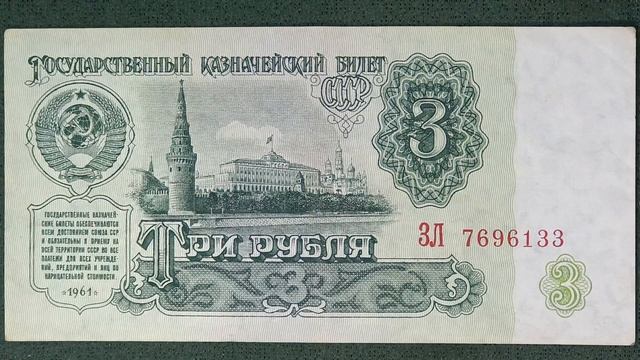 Трехрублевая купюра образца 1961 года имеет зеленую цветовую гамму и на лицевой стороне изображена панорама Московского Кремля, а на оборотной стороне указан номинал цифрой и словами. Она была введена в обращение после денежной реформы 1961 года и оставалась в обращении до конца 1993 года. Описание купюры: Размер: 113 x 57 мм. Цвет: Преимущественно зеленый. Лицевая сторона: #нумизматика #coin #монета В центре – гравюра с изображением Московского Кремля (Водовзводная башня, Большой Кремлевский дворец, колокольня Ивана Великого, несколько церквей). Сверху надпись: "ГОСУДАРСТВЕННЫЙ КАЗНАЧЕЙСКИЙ БИЛЕТ". Справа от надписи – розетка с числом "3". Слева – герб СССР образца 1956 года с 15 витками ленты. Под гербом – надпись о гарантиях государства и обязательности приема. Под изображением Кремля – надпись "ТРИ РУБЛЯ". Оборотная сторона: В центре – надпись "ТРИ РУБЛЯ". Слева – обозначение номинала цифрой "3". Справа – гильоширная розетка с цифрой "3". Под номиналом – указание номинала на языках союзных республик. Ниже – надпись об уголовной ответственности за подделку. Дополнительная информация: Купюра была отпечатана металлографским способом с лицевой стороны и орловским способом с оборотной. В 1991 году была проведена деноминация, и купюры 1961 года потеряли свою актуальность. #ссср #деньги #нумизматика #трëшка #фантик