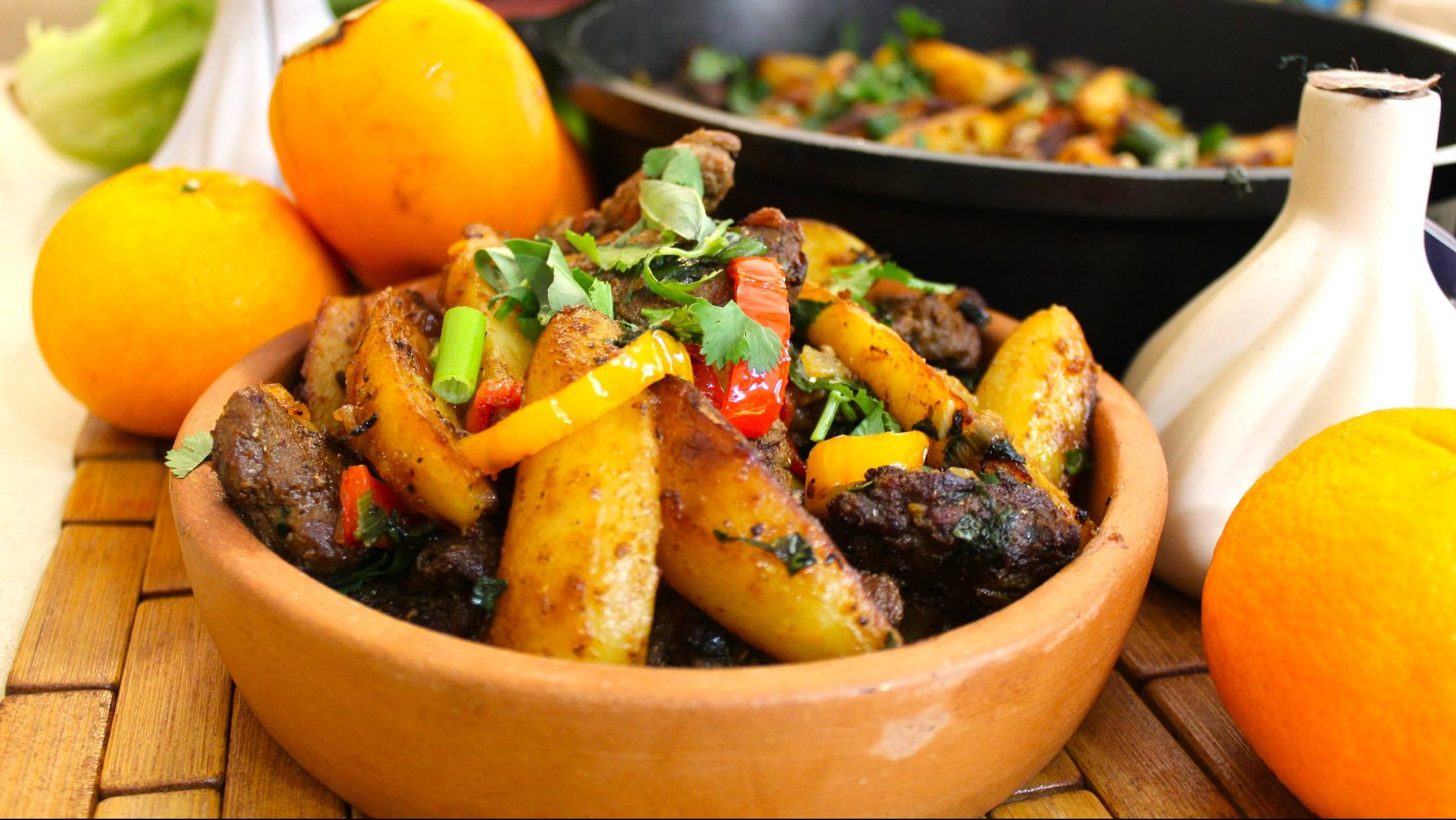 Для рецепта потребуется: по одному килограмму мяса и картофеля одна крупная луковица один острый перец кинза, базилик, зелёный лук 4-5 зубчиков чеснока пару крупных болгарских перца соль, чёрный перец по чайной ложке кориандра, уцхо сунели и паприки растительное масло