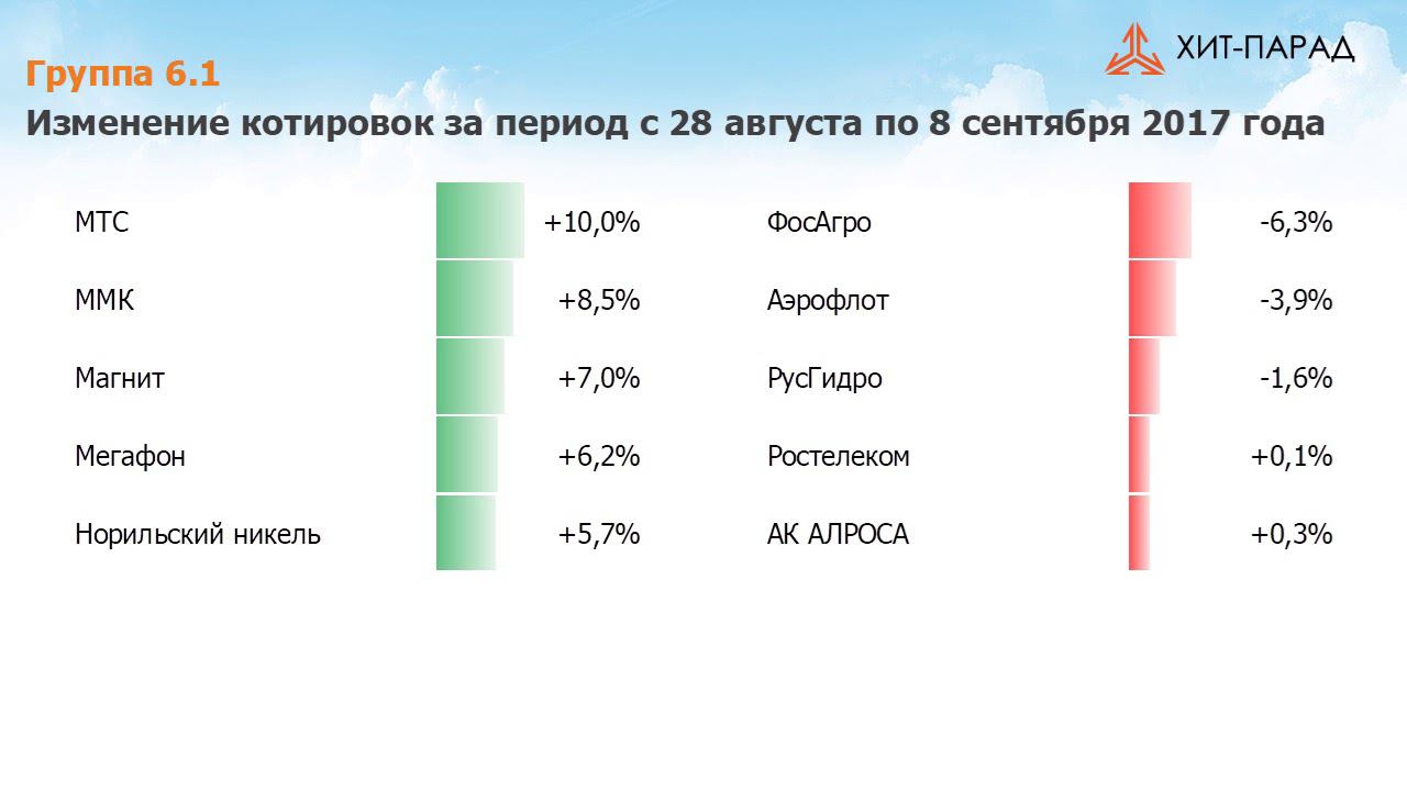 Здравствуйте, уважаемые зрители! С Вами в студии – Артем Абалов. Вашему вниманию предлагается традиционный обзор торгов на российском рынке акций за период с 28 августа по 8 сентября 2017 года. За прошедшие 2 недели индекс ММВБ вырос на 2,7% до отметки 2 032 пункта. Активность операторов рынка в отчетном периоде находилась на среднем уровне. Посмотрим, кто стал лидерами роста и снижения в разрезе традиционных групп акций. Группа 6.1 Пятерку лидеров возглавили акции МТС, выросшие на 10% после озвученного намерения компании возобновить программу выкупа собственных акций. На эти цели предполагается потратить до 20 млрд руб., а сама программа ,как ожидается, будет действовать до апреля 2019 года. Акции ММК выросли на 8,5% на ожиданиях включения бумаг в индекс MSCI Russia после проведенного SPO в размере 3% уставного капитала. Вновь порадовали своих держателей акции Магнита, прибавившие 7% в отсутствии значимых корпоративных новостей. Думается, что причиной роста стало поступление на рынок новых средств нерезидентов, в первую очередь, традиционно приобретающих тяжелые индексные бумаги. Схожие причины способствовали росту котировок акций Норильского никеля. Наконец, бумаги Мегафона подорожали более чем на 6% на фоне слабой отчетности по итогам полугодия. Возможно, инвесторы оценили стабилизацию ряда операционных показателей компании, таких как абонентская база, сервисная выручка и выручка от мобильных услуг. Пятерку аутсайдеров возглавили акции ФосАгро, потерявшие свыше 6% на фоне укрепления рубля. Снижение почти на 4% продемонстрировали и бумаги Аэрофлота на фоне падения операционной прибыли по итогам полугодия. Хуже рынка выглядели акции Ростелекома, РусГидро и АЛРОСы. В последнем случае продолжает сохраняться негативный эффект от аварии на руднике «Мир», которая может повлечь за собой существенные расходы для алмазной компании. читать далее http://arsagera.ru/info-blok/arsmedia_video-materialy_kompanii/regular/rynok_akcij_hitparad_108_ot_08092017/