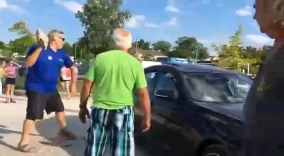 Собака оказалась запертой в БМВ, который стоял на жаре. Чтобы спасти животное, мужчина камнем разбил стекло в автомобиле.