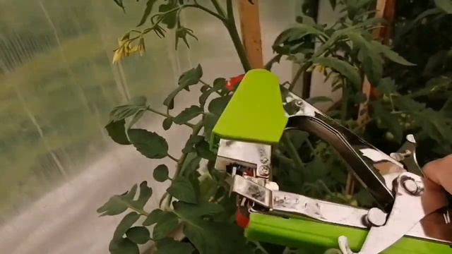 №302 Не вязание. Подвязываю томаты тапенером. Новый помощник трудится в теплице.