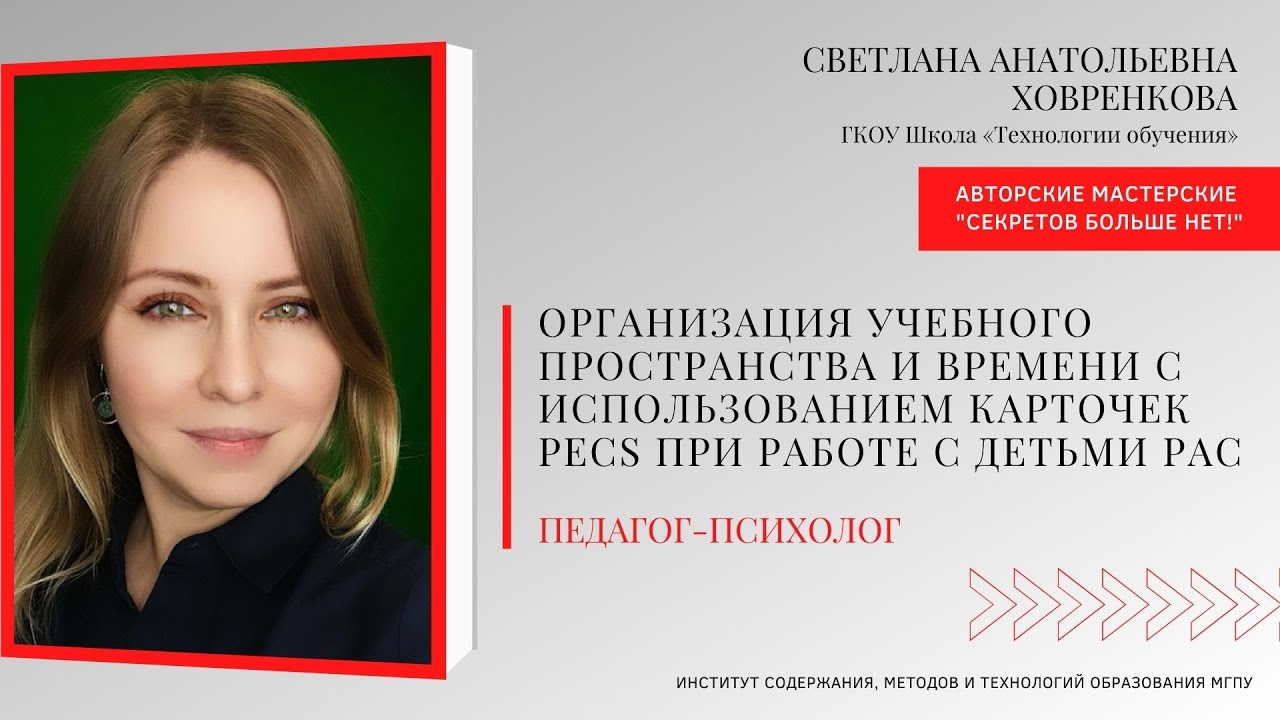 Ведущая: Ховренкова Светлана Анатольевна, педагог-психолог ГКОУ Школа «Технологии обучения» Тема: "Организация учебного пространства и времени с использованием карточек PECS при работе с детьми РАС"