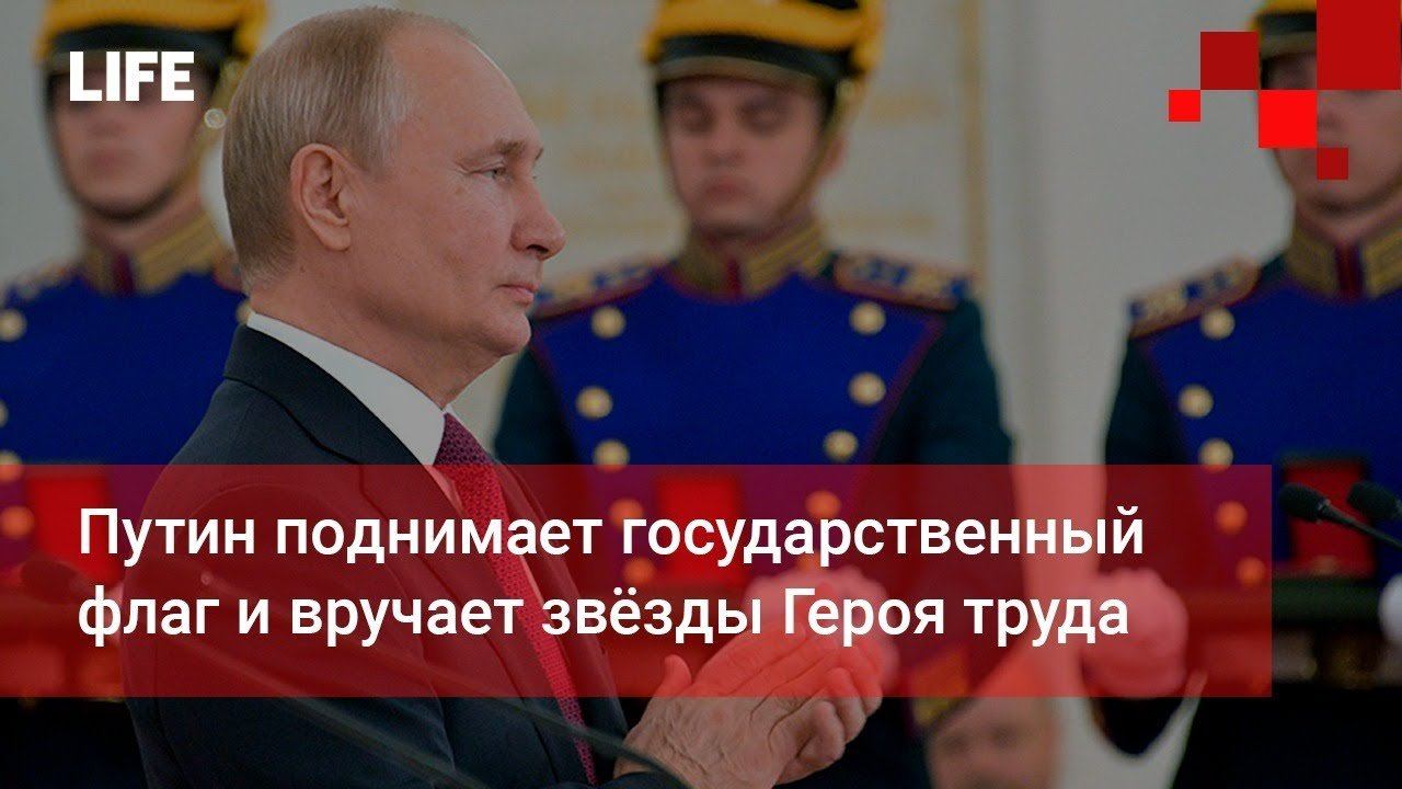 Путин поднимает государственный флаг и вручает звёзды Героя труда