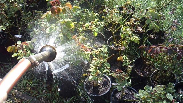 Сельхозработа: полив саженцев роз.