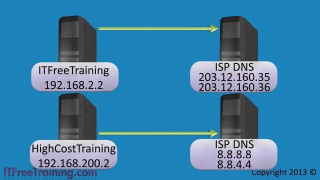 This video will look at how to configure DNS forwarding and conditional forwarding on Windows Servers. Forwarding allows all DNS requests to be forwarded to a particular server and conditional forwarding allows you to configure certain DNS queries to be sent to a particular DNS server. http://itfreetraining.com/handouts/dns/dnsforwardingdemo.pdf Demonstration Setting up forwarding To change the forwarding settings, open DNS manager. This can be run from the tools menu from server manager or running DNS from administrative tools in the control panel. The forwarding settings are located in the properties for the DNS server. To access these, right click on the server in DNS manager and select properties. If you do not have your DNS server listed, you will need to add it by right clicking DNS and selecting the option connect to DNS server. From the properties of the DNS server, select the forwarders tab. On the forwarders tab, press the button edit and then add the addresses of the DNS servers that you want to forward DNS requests to. Setting up conditional forwarding To configure conditional forwarders, first open DNS manager from the tools menu in server Manager or run DNS from Administrative tools. From DNS manager, right click Conditional forwarders and select the option New Conditional Forwarder. In the New Conditional Forwarder window, enter in the DNS domain that you want to forward DNS requests for and then add the DNS server that can answer DNS requests for that DNS domain. When you create the conditional forwarder, you also have the option to store that conditional forwarder in Active Directory. If you decide to tick this option, the conditional forwarder configuration can be replicated to all domains in the forest or only to DNS server in the current domain. It should be remembered that only DNS servers that are running on Domain Controllers will be able to access this information if you decide to use this feature. Clear local cache If you are having problems resolving an address or it is being resolved to the wrong address, it may be that the local computer has stored the result in the local cache. To remove this information, run the following command. Ipconfig /flushdns See http://YouTube.com/ITFreeTraining or http://itfreetraining.com for our always free training videos. This is only one video from the many free courses available on YouTube. References None