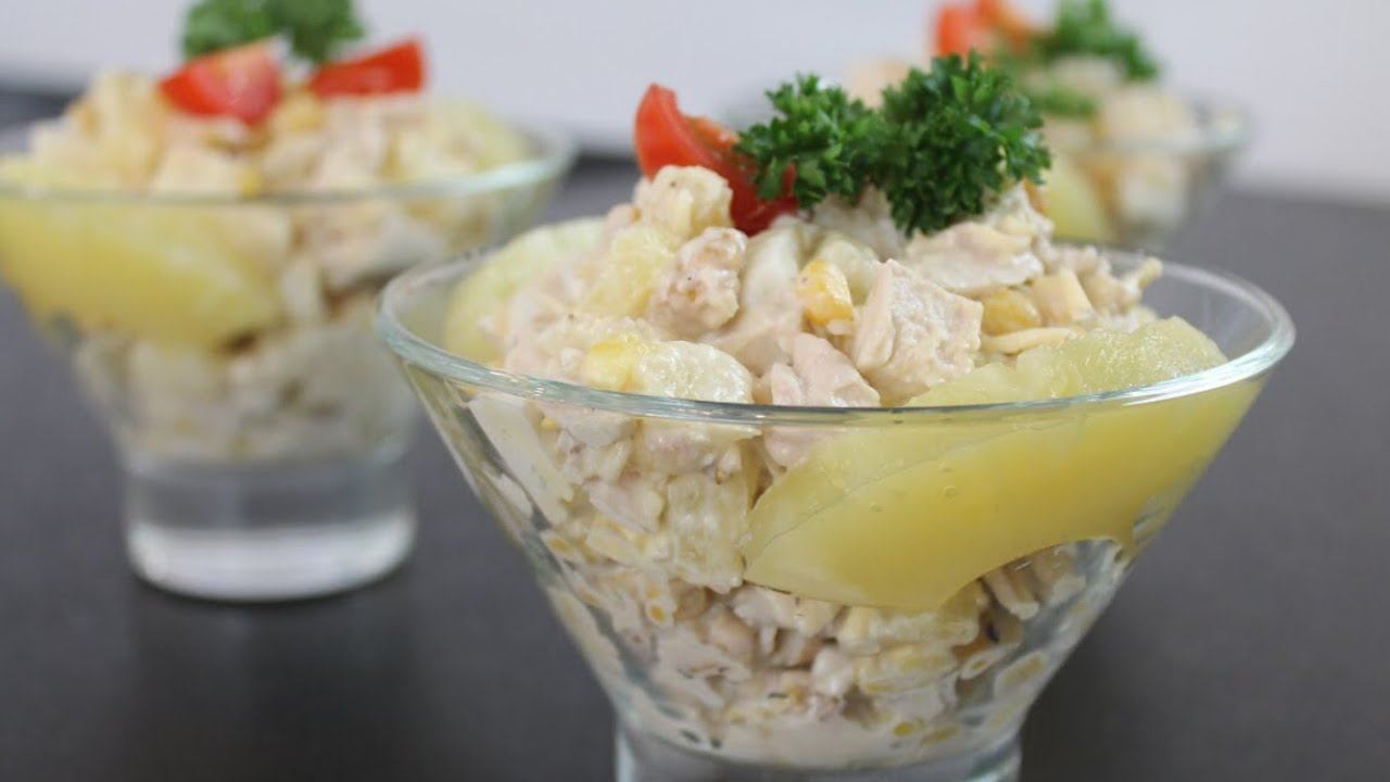 На любой праздник хочется подать не только вкусный, но и красивый салат. Предлагаю приготовить салат с курицей и ананасами, это сочетание нравится многим. А украсим салат помидорами и зеленью. Подпть его можно в креманках! РЕЦЕПТ: куриное филе отварное 250 г яйца отварные 2-3 шт твердый сыр 100 г грецкие орехи 50 г консервированная кукуруза 200 г консервированный ананас 500 г майонез 100 г петрушка и помидоры черри для украшения ***************** Подписывайтесь на мой канал! Здесь Вы найдете много быстрых видео рецептов приготовления блюд: https://is.gd/URkQ1C Подписывайтесь на страничку Instagram: https://www.instagram.com/tastyfood_yarik/ Яндекс Дзен: https://zen.yandex.ru/tastyfood_yarik #салат #салаты #праздничныйсалат #салатскуринымфиле #салатсананасом #салатскукурузой #салатнапраздник #рецептысалатов #салатырецепты #рецепты #рецептынапраздник #кухнязаоднуминуту #кухняза1минуту